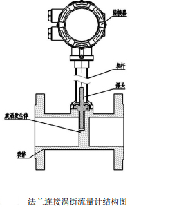法蘭連接型渦街流量計的基本結構主要是由表體、探頭、旋渦發(fā)生體、表桿和轉換器等組成。