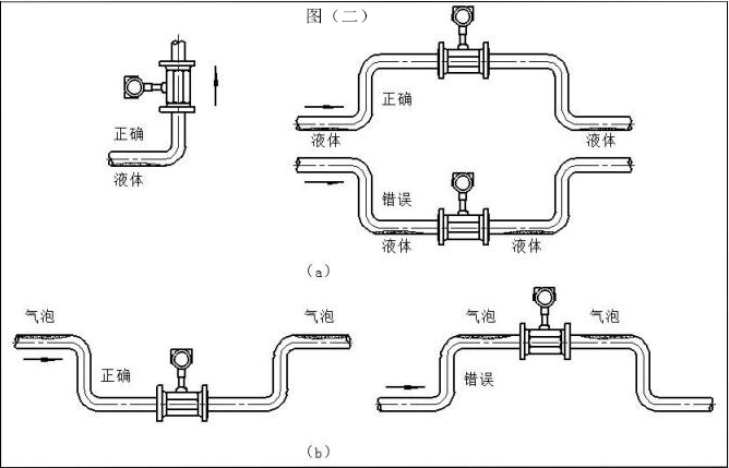 8、測量液體時,為了保證管內充滿液體,所以在垂直或傾斜管道安裝儀表時,應該保證液體流動方向從下而上。若管道內含少量氣體,
