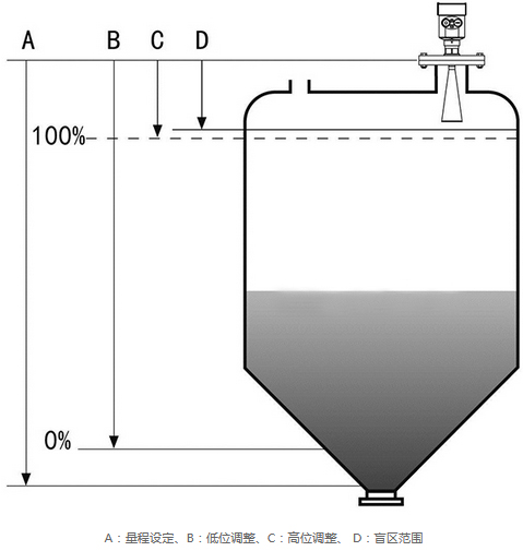 6、若介質(zhì)為低介電常數(shù)當(dāng)其處于低液位時(shí),罐低可見,此時(shí)為保證測量精度,建議將零點(diǎn)定在低高度為C 的位置。