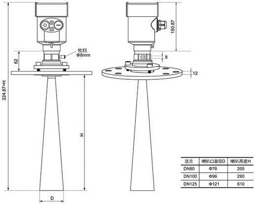 7、理論上測量達(dá)到天線*的位置是可能的,但是考慮到腐蝕及粘附的影響,測量范圍的終值應(yīng)距離天線的*至少100mm。