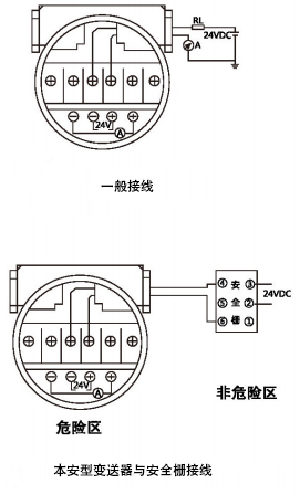 ●變送器的端子位于中繼箱內,電纜線從中繼箱的引線口接人。中 間兩端子為24V DC輸入端,兩邊的兩端子為顯示表頭接線端子;