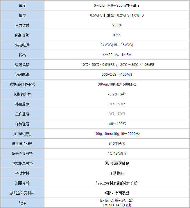 投入式靜壓液位計由擴散硅壓阻式壓力傳感器作為測量元件,把與液體深度成正比的液體靜壓力準確測量出來,并經過信號調理電路轉換成標準(電流或電壓)信號輸出,建立起輸出信號與液體深度的線性對應關系,實現對液體深度的測量。產品精度高、體積小,直接投入液體中,即可測量出變送器末端到液面的液體高度,使用方便。適用于石油、化工、電廠、城市供水、水文勘探領域的液位測量與控制。