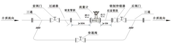1、為了便于維修,不影響流體正常輸送,必須設(shè)置旁通管道,當(dāng)氣體內(nèi)含有較大顆?;蜉^長(zhǎng)纖維雜物時(shí),旋進(jìn)旋渦流量計(jì)必須安裝過(guò)濾器;
