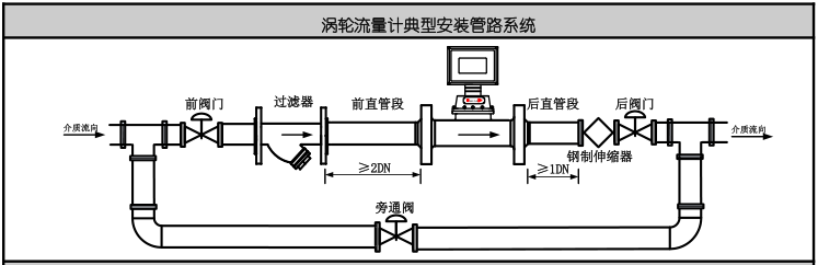 8、任何情況下,在渦輪流量計(jì)的上游應(yīng)安裝一段公稱直徑與流量計(jì)的公稱直徑相同的直管段,長(zhǎng)度要求≥2DN;同時(shí)其下游也必須安裝一段與流量計(jì)的公稱直徑相同的直管段或彎管,并且要求其總長(zhǎng)≥2DN。