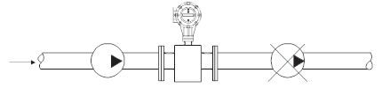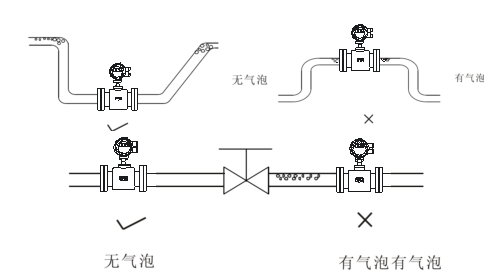電磁流量計(jì)應(yīng)安裝在閥的上游,因?yàn)橛捎陂y的作用,管道中壓力會(huì)降低, 從而產(chǎn)生氣泡。