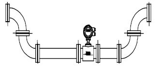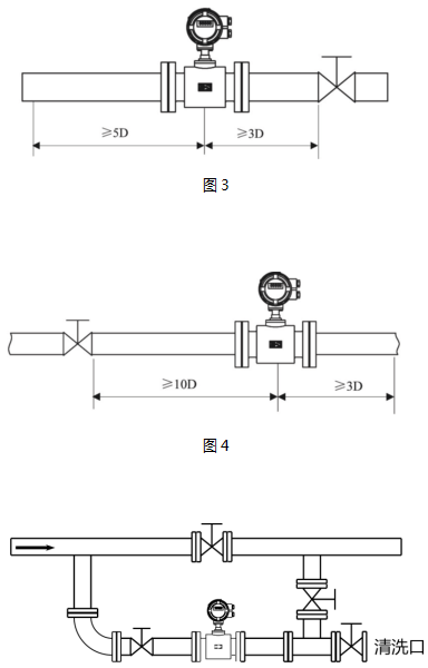 為確保流量計(jì)的測(cè)量精度,建議應(yīng)保證傳感器上游直管段長(zhǎng)度至少應(yīng)為5倍管徑(5D),下游直管段長(zhǎng)度至少應(yīng)為3倍管徑(3D)。(見(jiàn)圖3、圖4)