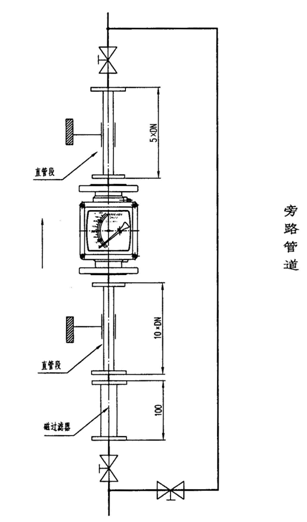 7、為了便于流量計(jì)的保養(yǎng)維修,磁過濾器的清洗以及用戶管路的定期維護(hù)保養(yǎng),建議使用如圖所示的旁路管道。當(dāng)流量計(jì)用于氣體測量時(shí),應(yīng)保證 管道內(nèi)的工作壓力不少于5倍流量計(jì) 的壓力損失,使流量計(jì)能夠穩(wěn)定正常動(dòng)作。 圖6 安裝圖