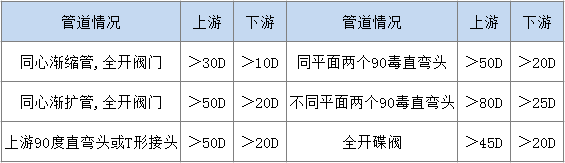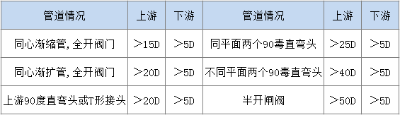 1、渦街流量計(jì)上游側(cè)和下游側(cè)必須要有足夠長(zhǎng)的同徑直管段。長(zhǎng)度應(yīng)符合下表的要求。