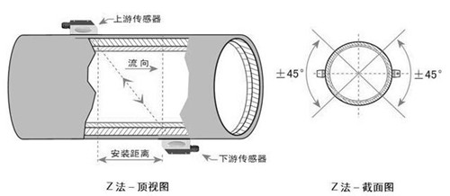 當管道很粗或由于液體中存在懸浮物、管內壁結垢太厚或襯里太厚等原因,造成V法安裝信號弱,機器不能正常工作時,就需要選用Z法安裝。Z法的特點是超聲波在管道中直接傳輸,沒有反射(稱為單聲程),信號衰耗小。Z法安裝可測管徑范圍為100mm至6000mm?,F場實際安裝時,建議200mm以上的管道都要選用Z法安裝。