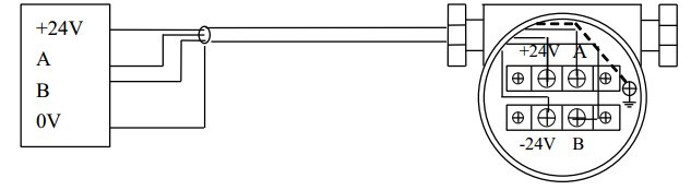 帶RS-485通訊功能的渦街流量?jī)x表采用DC24V電源供電,與其它設(shè)備之間采用四線制傳輸方式。