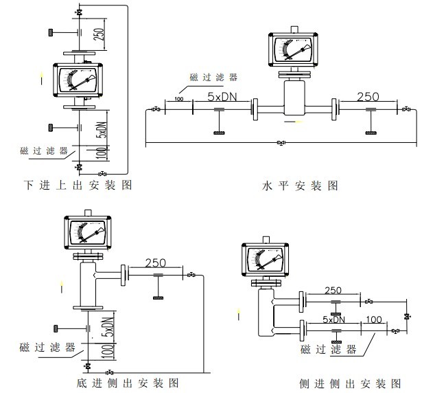 ●為了保證測(cè)量精度,推薦在金屬轉(zhuǎn)子流量計(jì)上游安裝5DN的入口直管段,下游安裝250mm出口直管段。